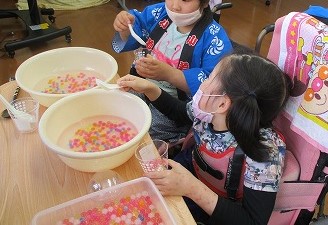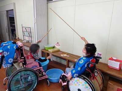 柏崎の6月の風物詩「えんま市」の屋台に見立てた、射的やボールすくいなどのコーナーを用意し、ミニえんま市をを楽しみました。